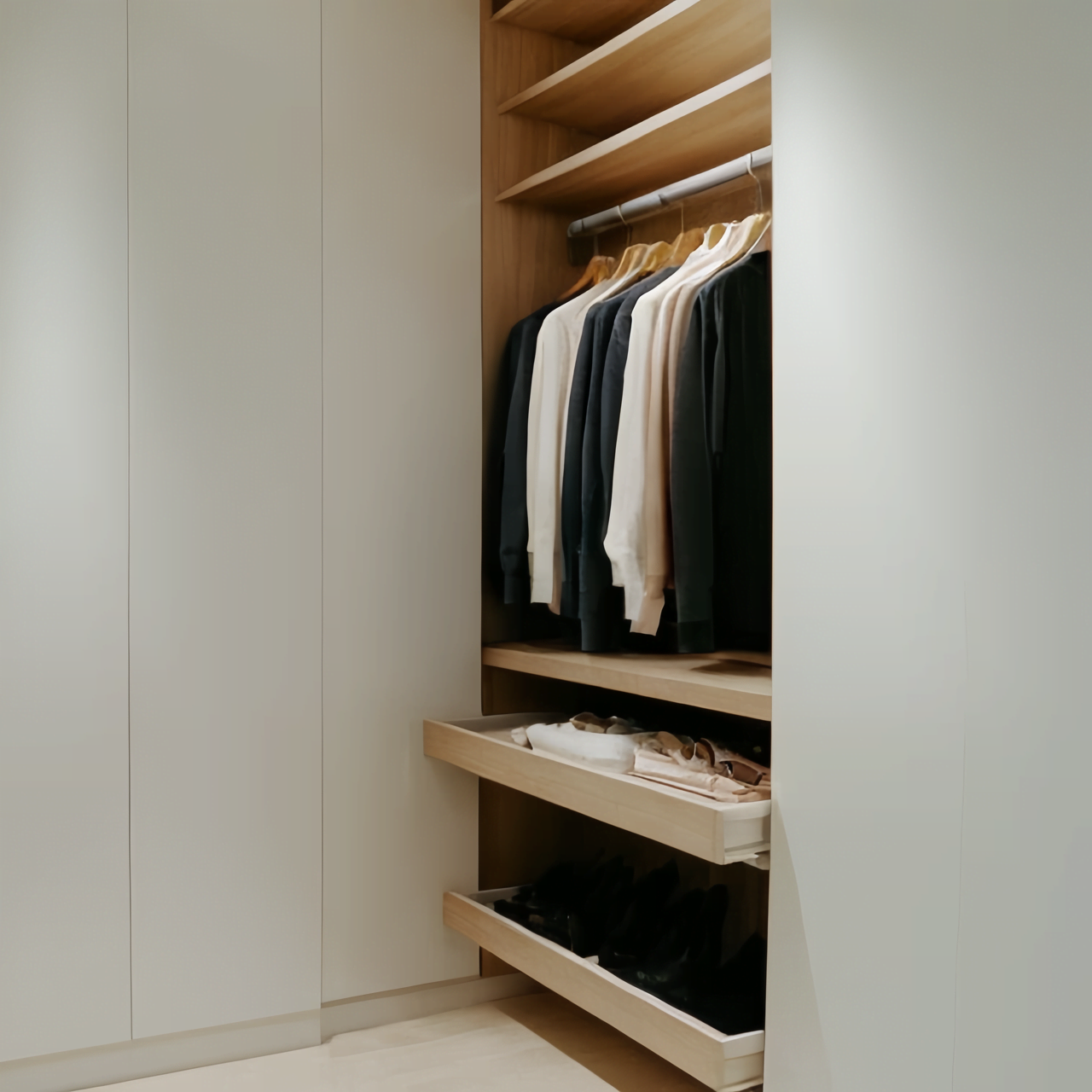 Искали идеальное решение для гардеробной, обошли много компаний, но только в "Вещи на Месте" нам предложили проект, где каждая полка и ящик предназначены для конкретных вещей с учетом час...