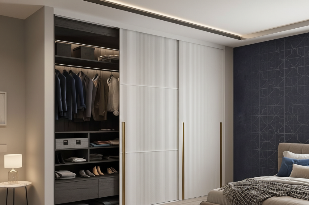 Шкаф с раздвижными фасадами создаёт аккуратный и цельный образ спальни, экономя пространство за счёт продуманной конструкции. Фактурные панели с вертикальным рельефом добавляют глубину и делают внешний вид более выразительным. Внутреннее наполнение с разными уровнями хранения — от штанг до полок и ящиков — позволяет чётко распределить вещи по категориям. Встроенная подсветка подчёркивает структуру и облегчает навигацию внутри, делая систему хранения максимально продуманной и визуально лёгкой.