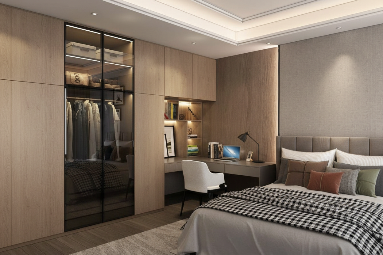 Встроенный шкаф в спальне объединён с полноценным рабочим местом, создавая удобное и продуманное пространство для жизни и работы.