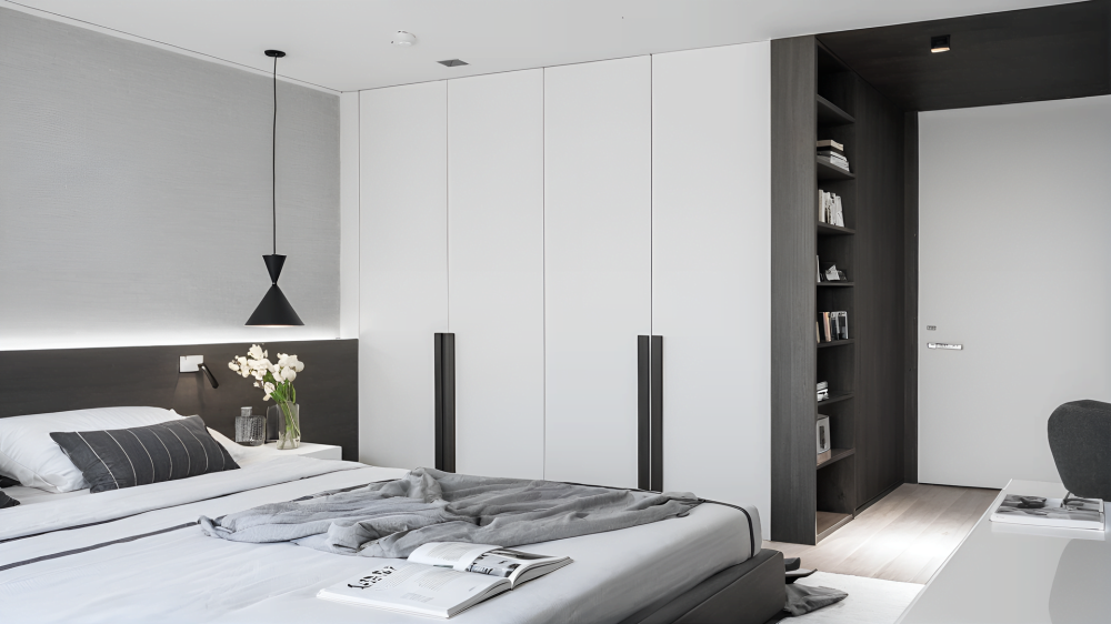 Шкаф-стена и прилегающая полка идеально вписаны в пространство, экономя место и создавая ощущение единого целого. Функциональность и стиль!