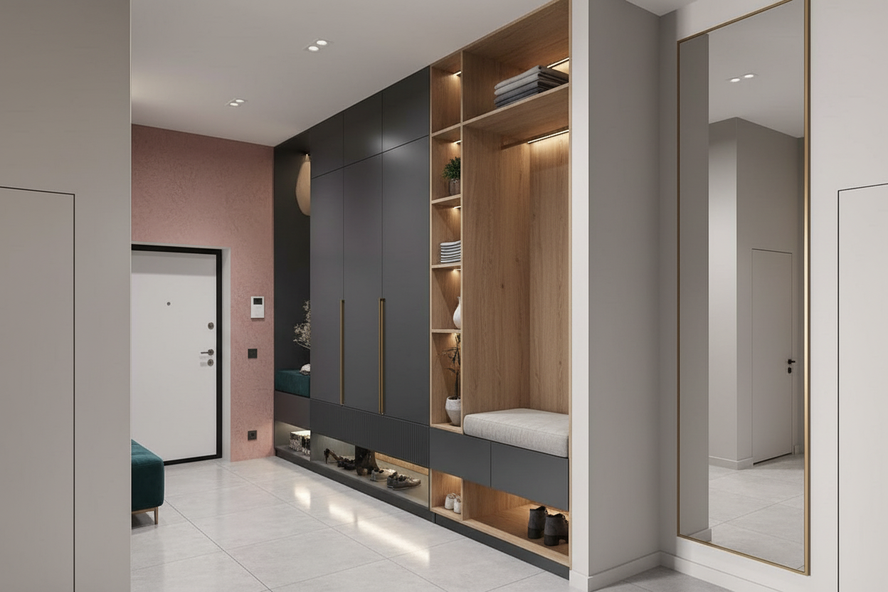 Прихожая выстроена как многофункциональная система хранения с продуманной композицией. Закрытые фасады скрывают основные вещи, сохраняя чистоту пространства, а открытые секции с подсветкой добавляют глубину и позволяют разместить декор и повседневные предметы. Встроенная зона с сиденьем делает сценарий входа более практичным, а нижний уровень хранения помогает организовать обувь без лишнего визуального шума. Контраст тёмных фасадов и тёплой древесной текстуры создаёт выразительный и современный образ.