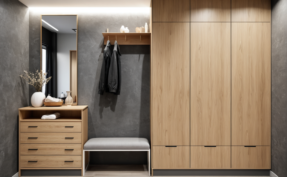 Зеркало в полный рост и удобная скамья делают прихожую максимально комфортной для сборов.
