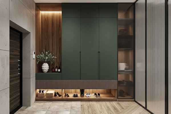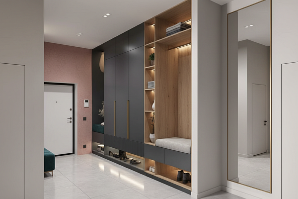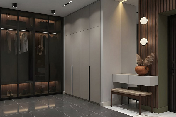 Прихожая построена на сочетании выразительных материалов и чёткой геометрии. Встроенный шкаф с древесными фасадами формирует цельный объём и скрывает всё лишнее, поддерживая аккуратный внешний вид. Вертикальные ручки задают ритм и подчёркивают высоту пространства. Зона с консолью и акцентной отделкой создаёт визуальный центр, а нижний модуль позволяет организовать хранение повседневных вещей, сохраняя порядок у входа.
