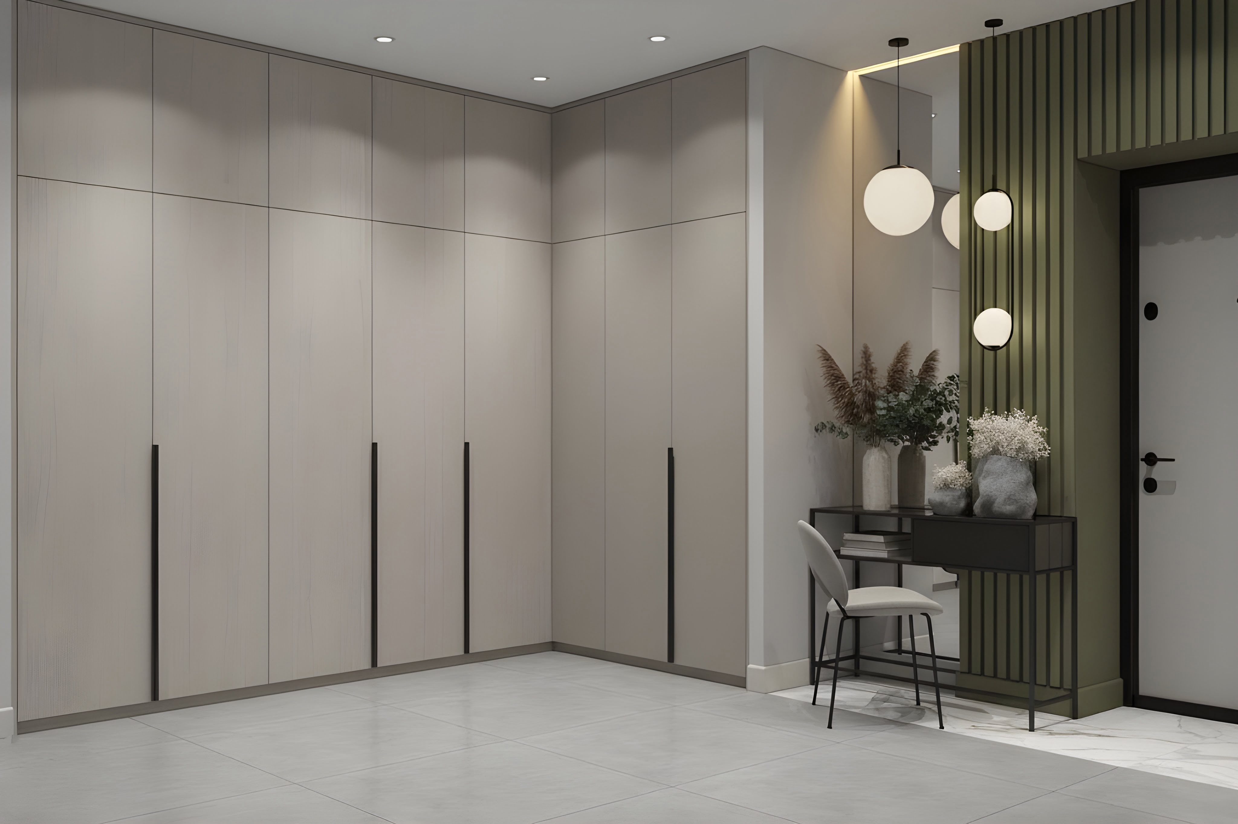 Прихожая с угловой системой хранения позволяет задействовать пространство максимально рационально, формируя цельный и аккуратный объём. Светлые фасады с вертикальными ручками создают строгий ритм и визуально расширяют помещение. Большое количество секций помогает грамотно распределить вещи и скрыть всё лишнее. Зона с консолью и декоративной подсветкой дополняет композицию, добавляя глубину и завершённость интерьеру.