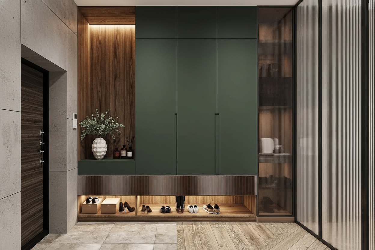 Прихожая выполнена как выразительная композиция с акцентом на цвет и фактуры. Глубокие зелёные фасады формируют цельный объём, а ниша с древесной отделкой добавляет тепла и визуальной глубины. Нижняя открытая зона с подсветкой позволяет аккуратно разместить обувь, сохраняя порядок у входа. Секция со стеклянными фасадами облегчает восприятие конструкции и добавляет интерьеру лёгкость, одновременно подчёркивая содержимое. Такое решение делает пространство собранным, продуманным и визуально выразительным.
