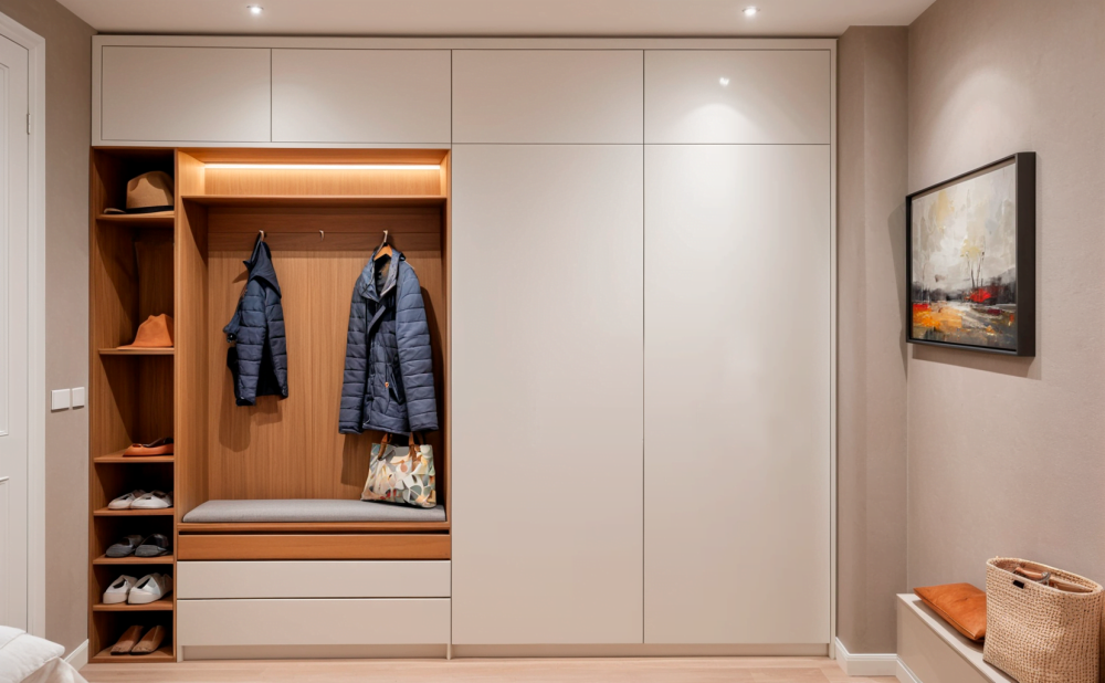 Открытые полки для аксессуаров и вместительный шкаф позволяют организовать хранение верхней одежды и обуви.