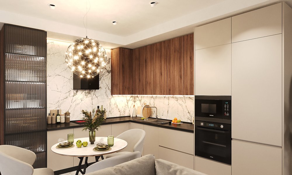 Верхние шкафы только по одной стороне позволяют расширить пространство и оставить место для стильной вытяжки.