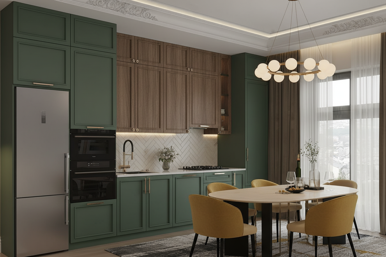 Кухня выстроена как выразительная композиция с акцентом на цвет и фактуры. Глубокие зелёные фасады сочетаются с тёплой древесной текстурой, создавая насыщенный и благородный образ. Верхние модули до потолка увеличивают вместимость и формируют цельный фронт без разрывов. Чёткое зонирование рабочих поверхностей и встроенная техника позволяют рационально организовать пространство, а светлая столешница и фартук добавляют баланса и визуальной лёгкости.