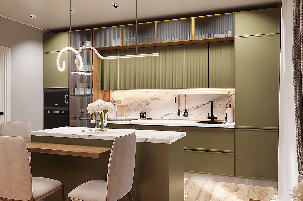 К матовым фасадам в фисташковом оттенке подобрана мраморная столешница и деревянный декор.