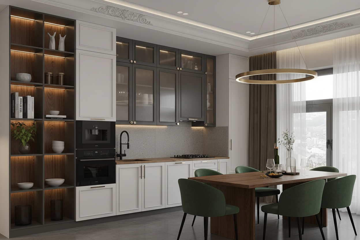 Кухня сочетает классическую эстетику и современные решения в единой композиции. Контраст светлых фасадов и тёмных витрин создаёт глубину, а стеклянные секции с подсветкой превращают хранение в выразительный элемент интерьера. Высокие модули до потолка увеличивают вместимость и формируют цельный фронт без лишних разрывов. Открытые стеллажи добавляют лёгкость и позволяют расставить акценты, а продуманное расположение техники и рабочих зон делает пространство логичным и собранным.