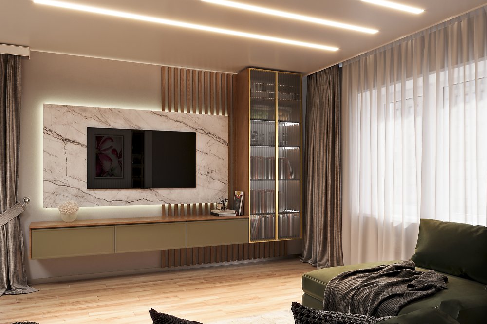 Функциональное зонирование – стильная ТВ-зона, стеклянный шкаф для хранения книг и декоративных элементов, удобные системы хранения – всё продумано до мелочей.