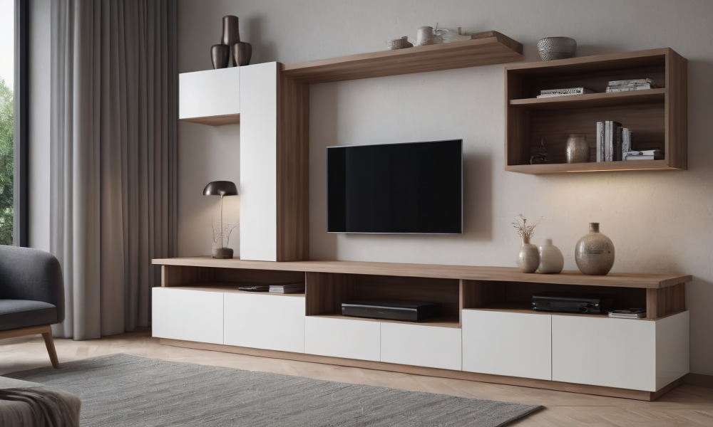 Функциональная организация – открытые и закрытые секции создают удобное пространство для хранения, позволяя разместить технику, книги и декор без ощущения загромождённости.