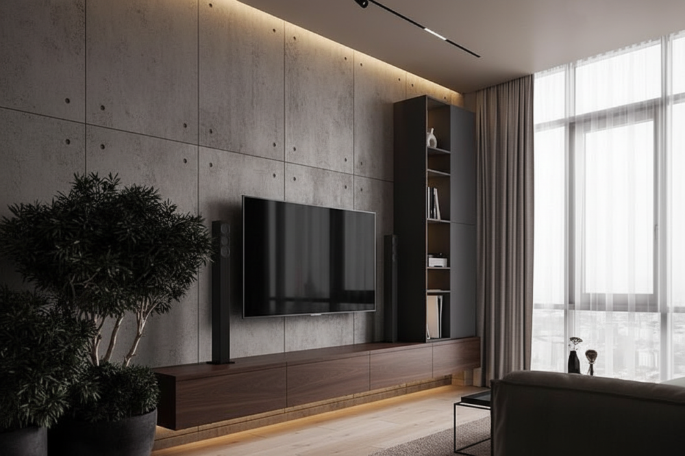 Гостиная в современном урбанистическом стиле с акцентом на лаконичности. Подвесная ТВ-тумба и высокий модуль хранения создают цельную композицию и визуальную лёгкость. Контраст фактуры бетона стены и текстуры дерева подчёркивает глубину интерьера и добавляет выразительности.