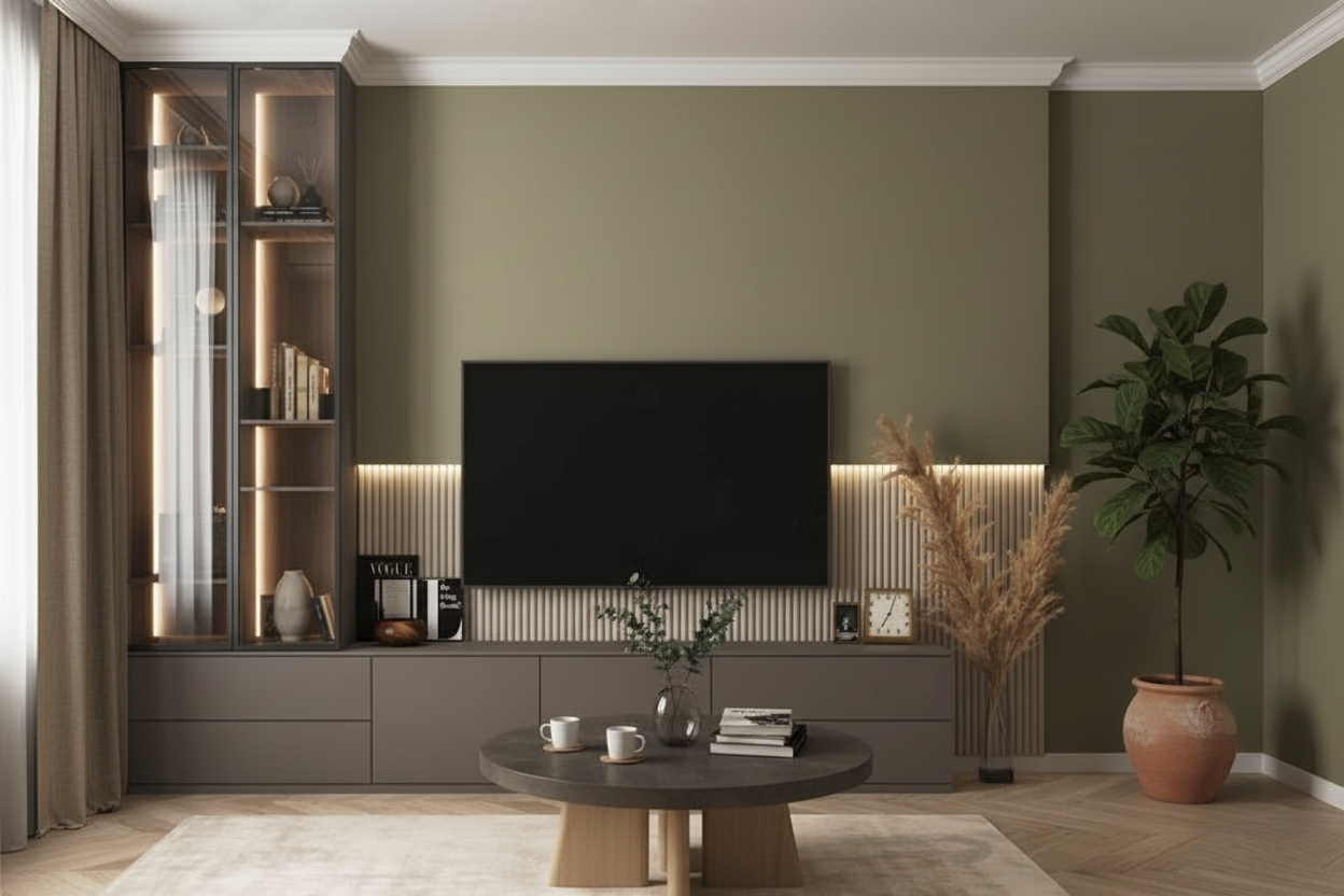 Функциональная ТВ-зона – встроенные системы хранения позволяют удобно разместить технику, книги и элементы декора, сохраняя порядок и эстетику.