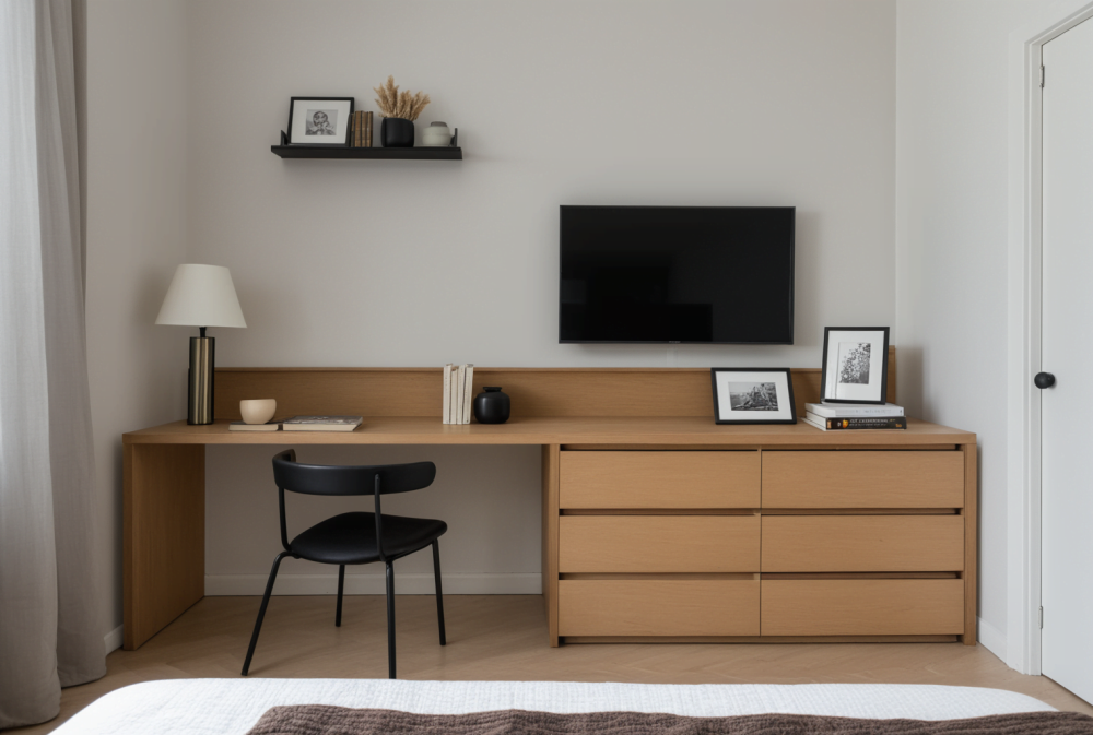 Рабочая зона с широким столешницей подходит как для работы за ноутбуком, так и для творчества