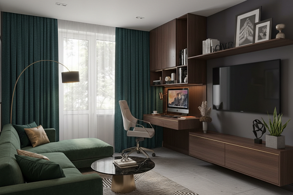 Рабочая зона встроена в общую композицию и органично продолжает интерьер, не перегружая пространство. Подвесной стол и открытые полки формируют лёгкую, «воздушную» конструкцию, а верхние модули с тонированными фасадами скрывают содержимое, сохраняя аккуратный вид. Подсветка подчёркивает глубину ниш и добавляет выразительности, позволяя расставить акценты. Такое решение помогает держать всё необходимое под рукой, при этом пространство остаётся чистым и визуально упорядоченным.