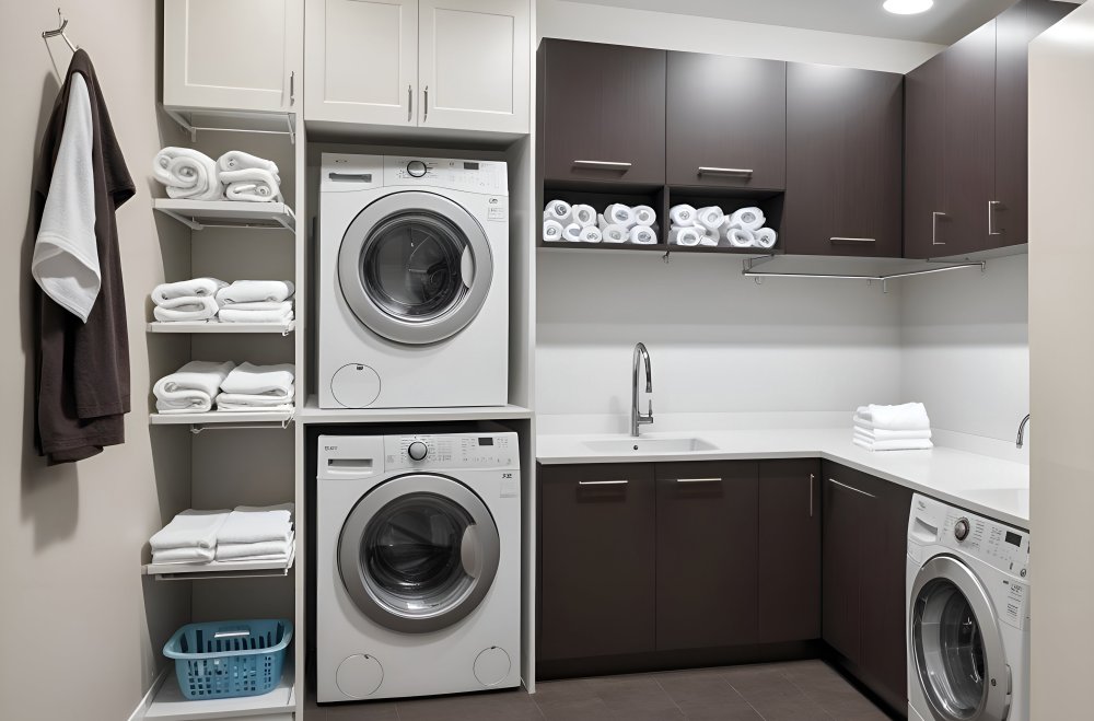 Просторная рабочая поверхность, встроенная зона с раковиной и место для сушки вещей делают уход за одеждой удобным и эффективным.