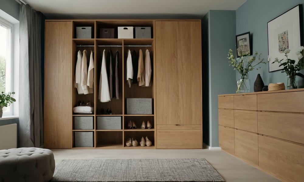 Открытые полки обеспечивают быстрый доступ к вещам, а закрытые секции помогают поддерживать чистоту и скрывать от посторонних глаз сезонные вещи.