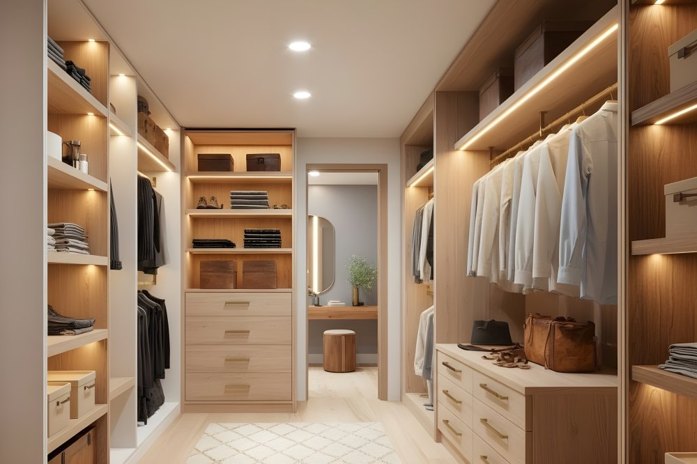 Эта гардеробная — воплощение баланса эстетики и функциональности. Тёплый оттенок натурального дерева создаёт уют, а мягкая встроенная подсветка подчёркивает геометрию пространства и придаёт ему атмосферу премиальности.