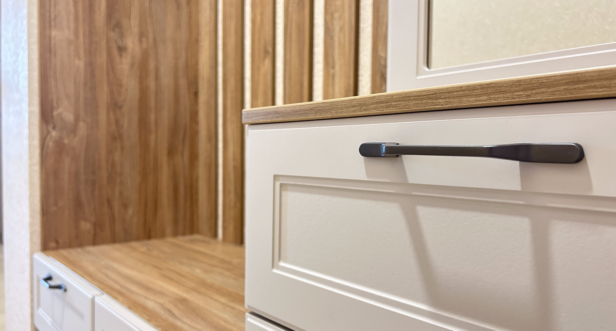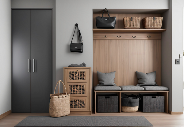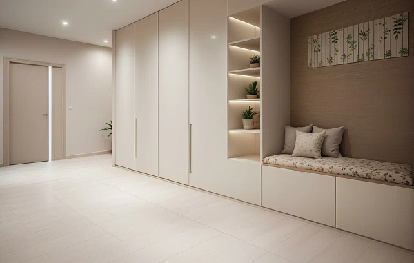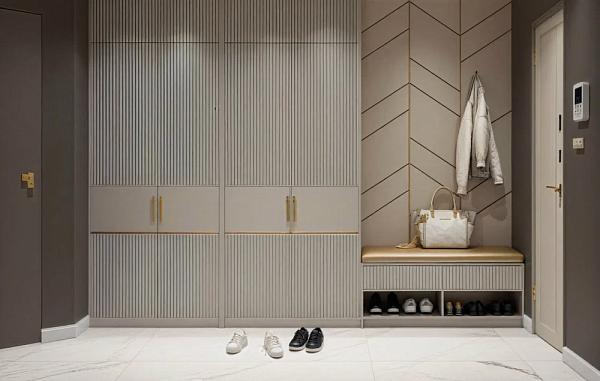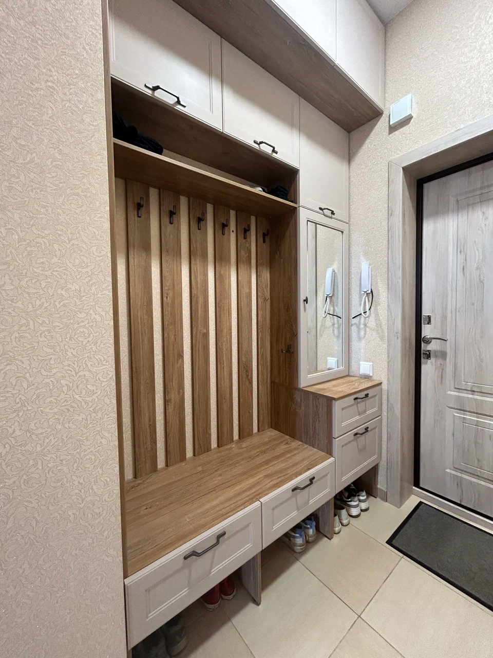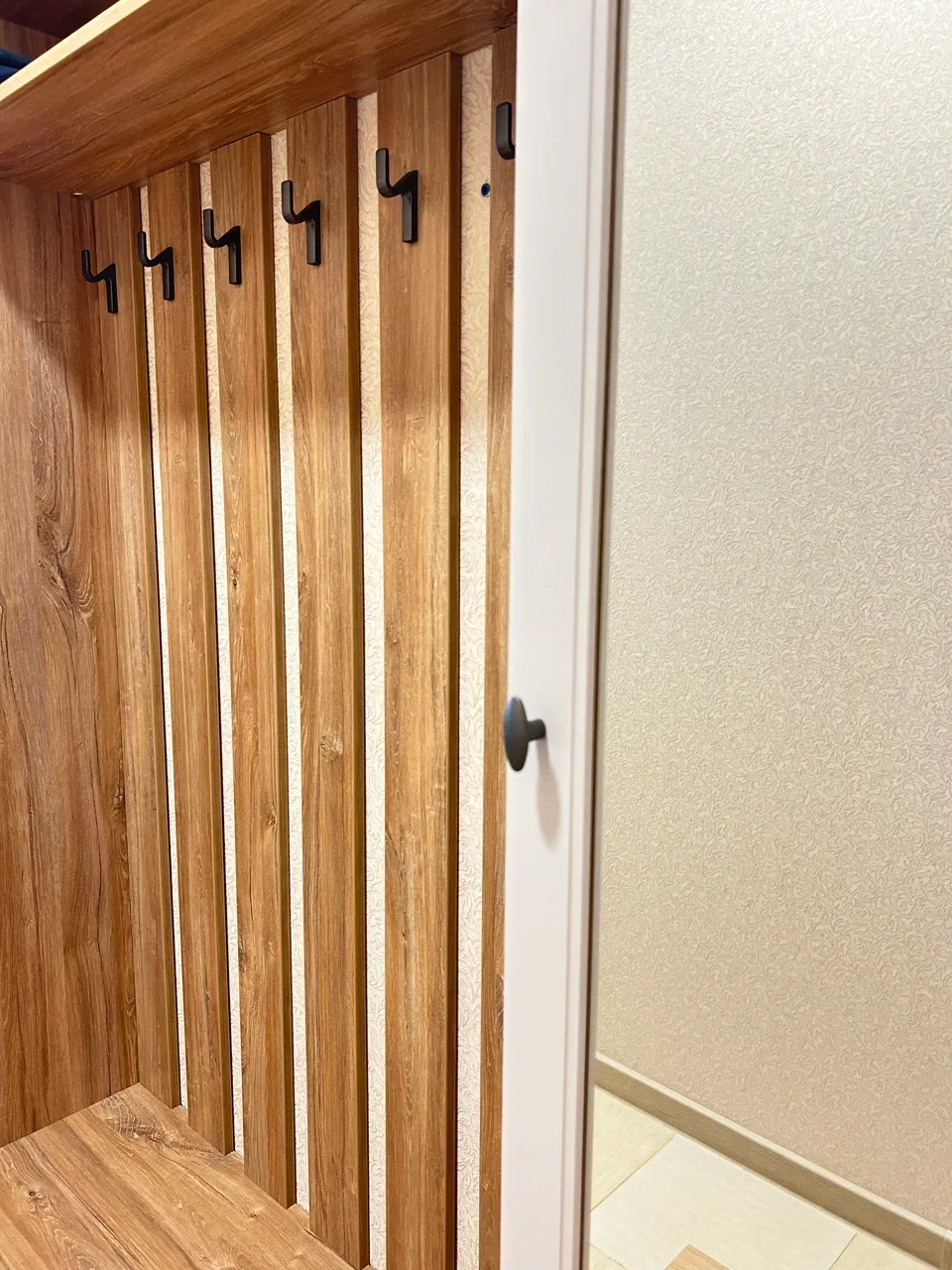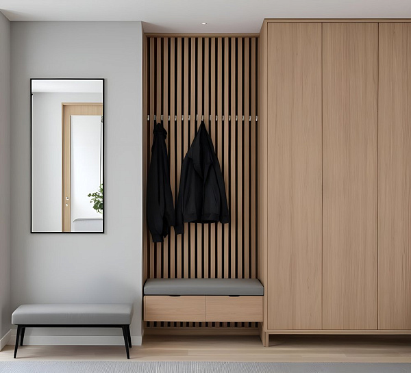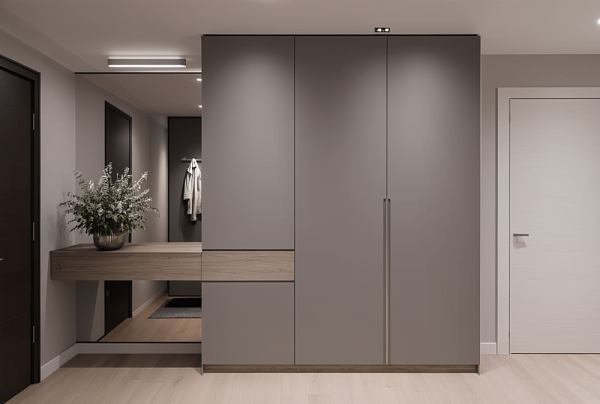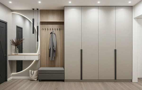 Открытые и закрытые секции под обувь, вместительные антресоли и зеркало, чтобы улыбнуться себе перед выходом.