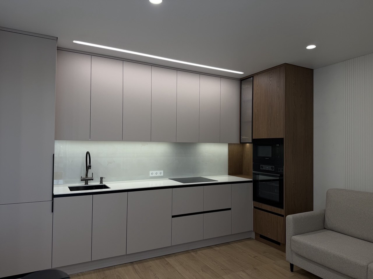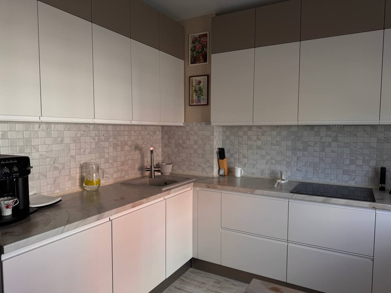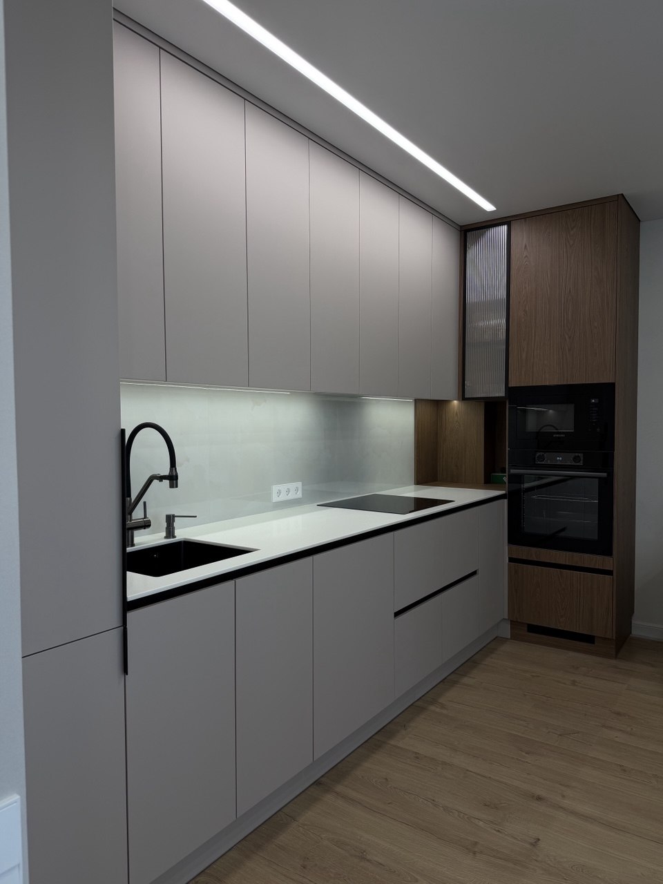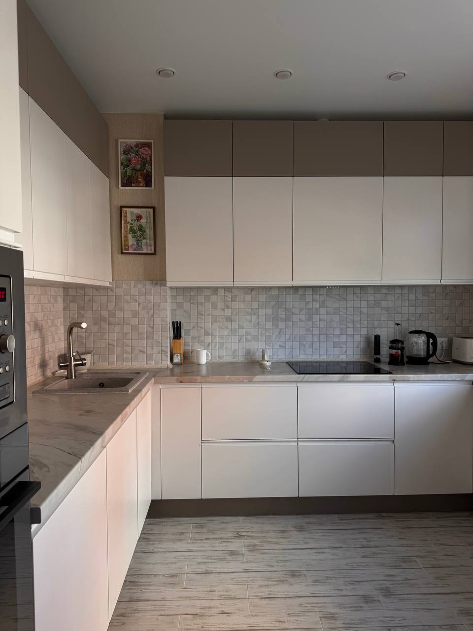 Современная кухня в светлых тонах с лаконичным дизайном идеально впишется в любой интерьер. Шкафы до потолка обеспечивают максимум пространства для хранения и визуально делают помещение выше и аккуратнее. Вместительные выдвижные ящики позволяют удобно организовать посуду и аксессуары, а рабочая зона выполнена из практичного материала, устойчивого к износу и загрязнениям.