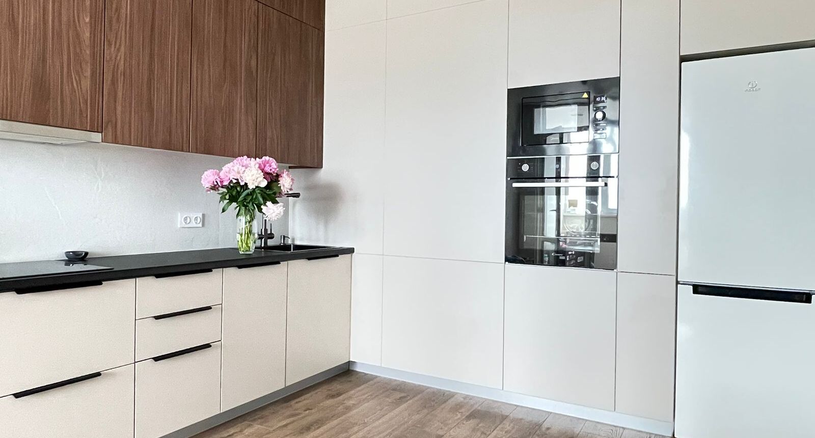 — Светлые фасады без ручек создают ощущение легкости и простора, а теплая текстура дерева придает интерьеру уют.