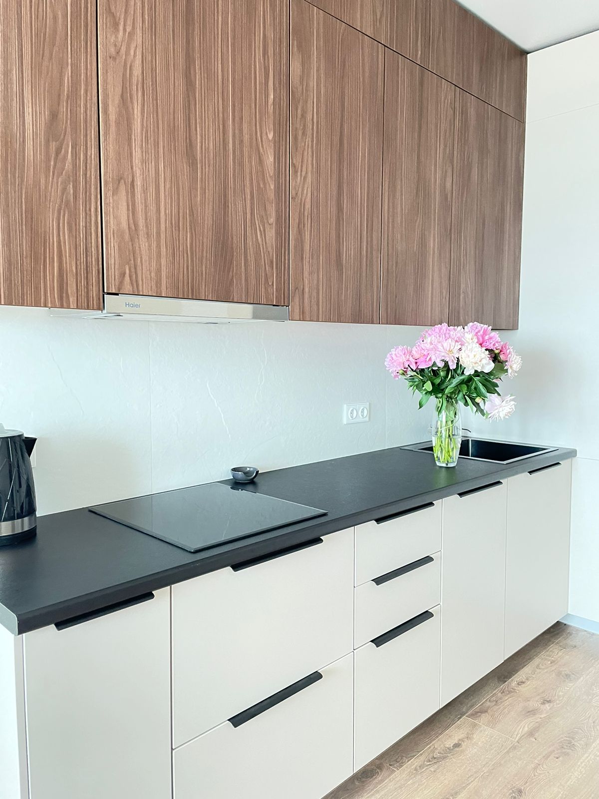 — Контрастная столешница и фурнитура добавляют глубины и акцентов.