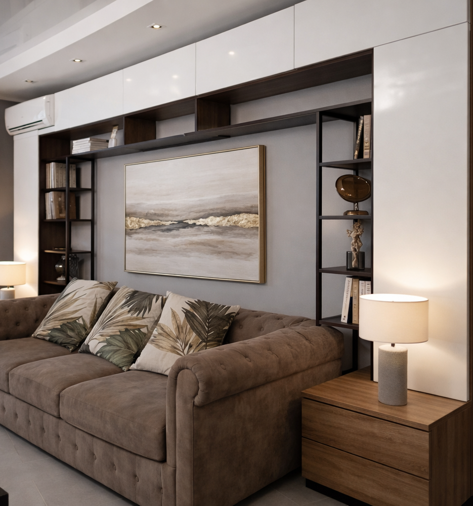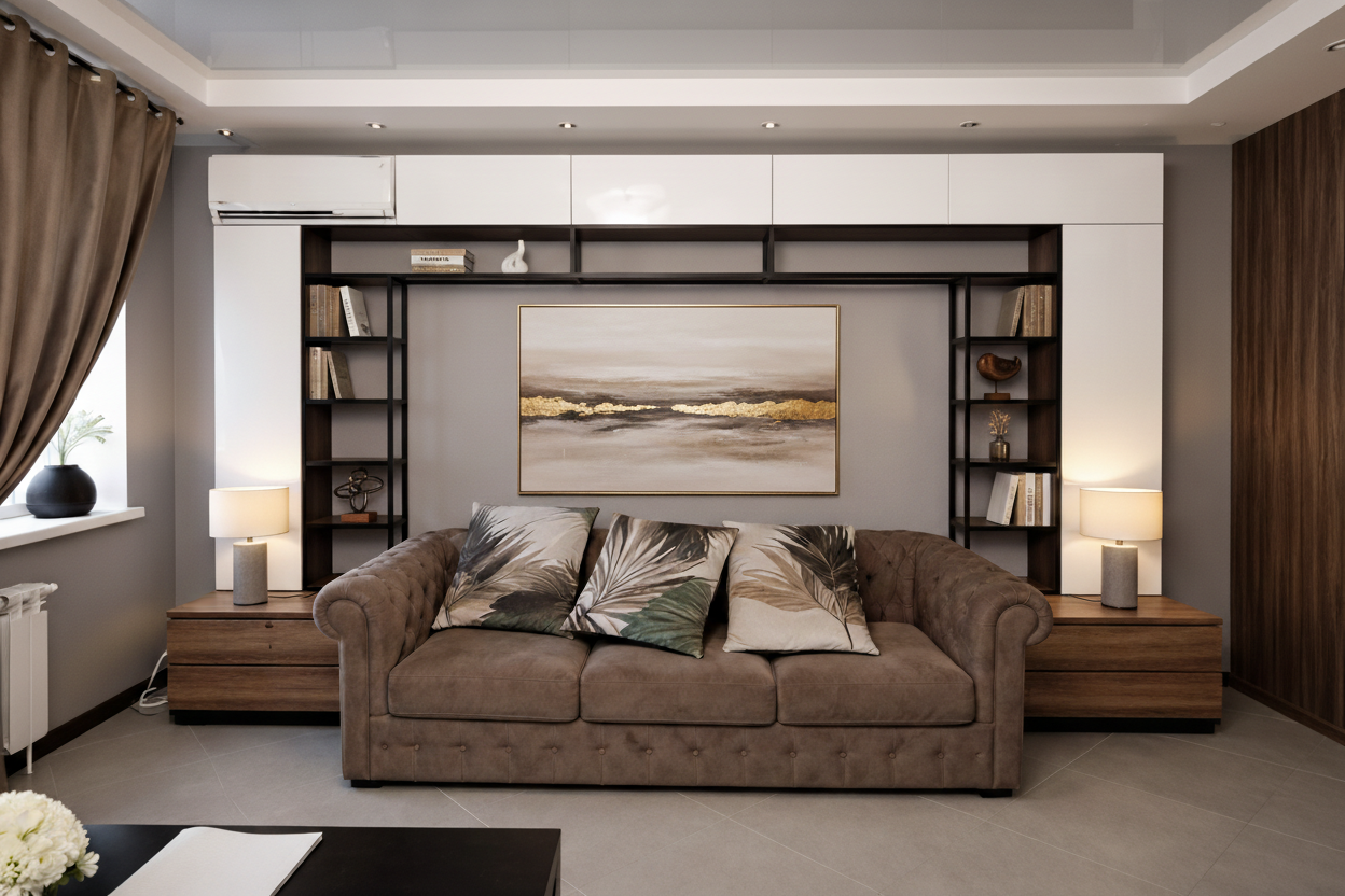 Стеллаж вокруг дивана - гениальное решение: гаджеты, книги, предметы для хобби всегда на своем месте и за ними даже не придется вставать.