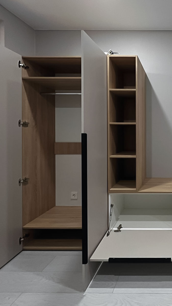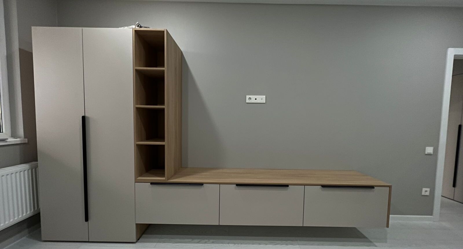 Модульная система с вместительными ящиками и шкафом сочетает светлые матовые фасады и текстуру натурального дерева. Открытые полки добавляют легкости и позволяют расставить декоративные элементы. Минималистичный дизайн и продуманная геометрия создают атмосферу порядка и уюта.
