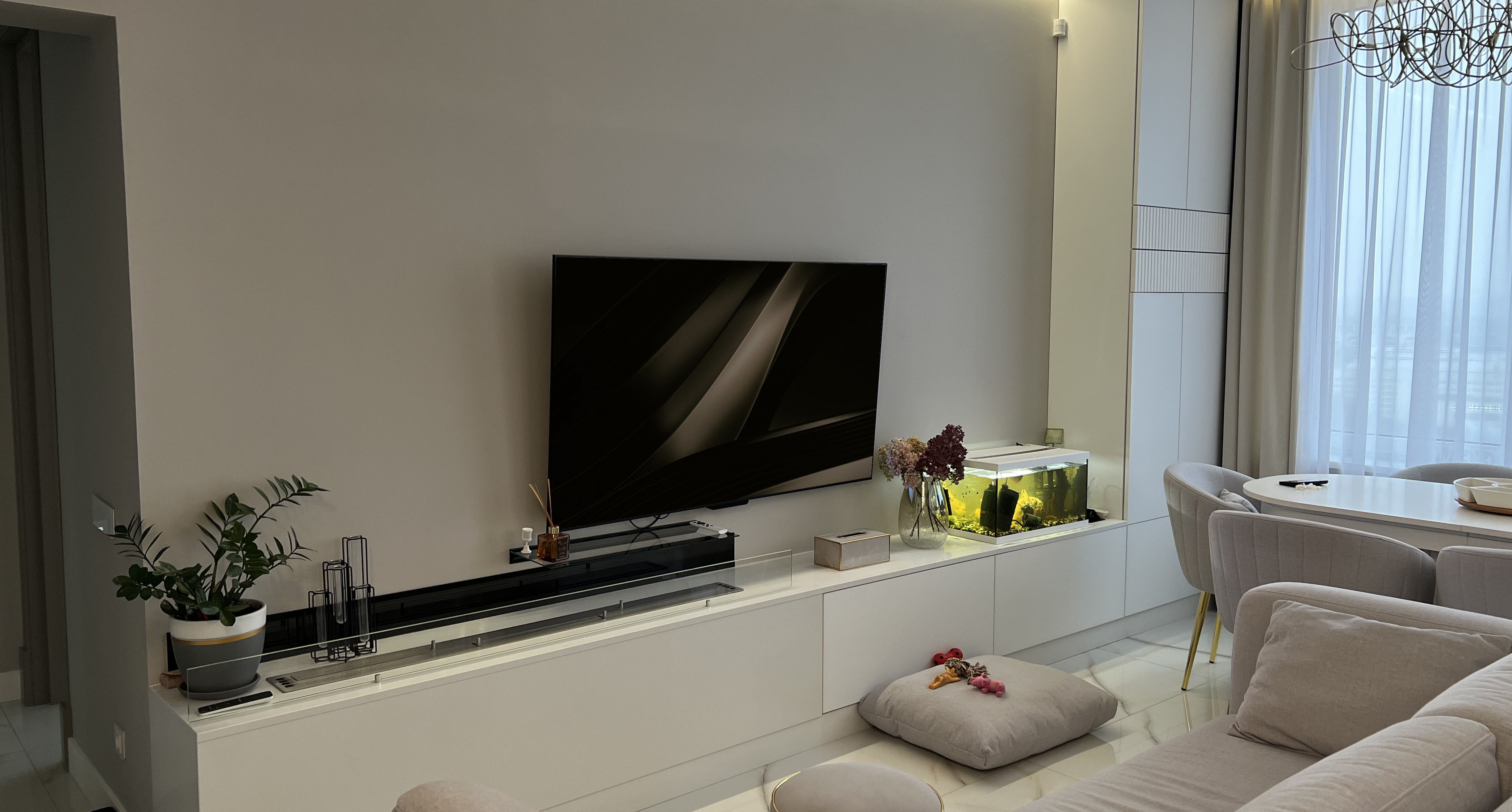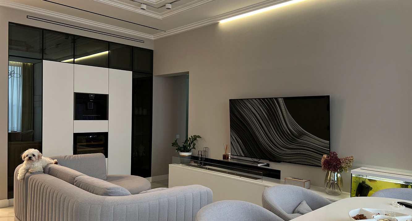 Гостиная спроектирована в помещение, объединенное с кухней. Это обусловило повторение материалов кухонного гарнитура: фасады выполнены в белой эмали и затемненном стекле. ТВ-зона вместительна и не крадет пространство. Стена из пеналов позволила вместить технику и удобно и доступно разместить посуду.