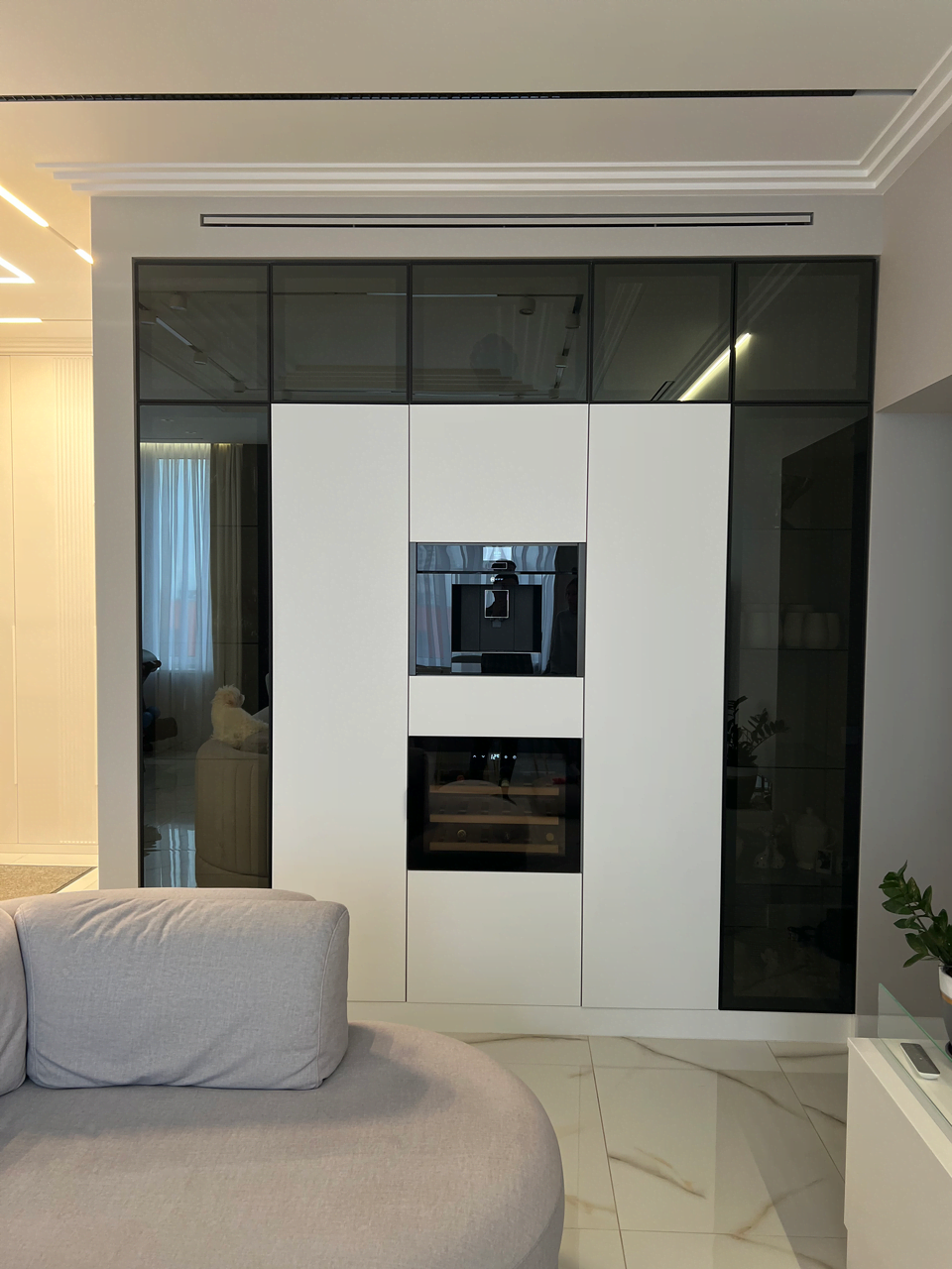 Гостиная-столовая в белой эмали со стеклянными буфетами