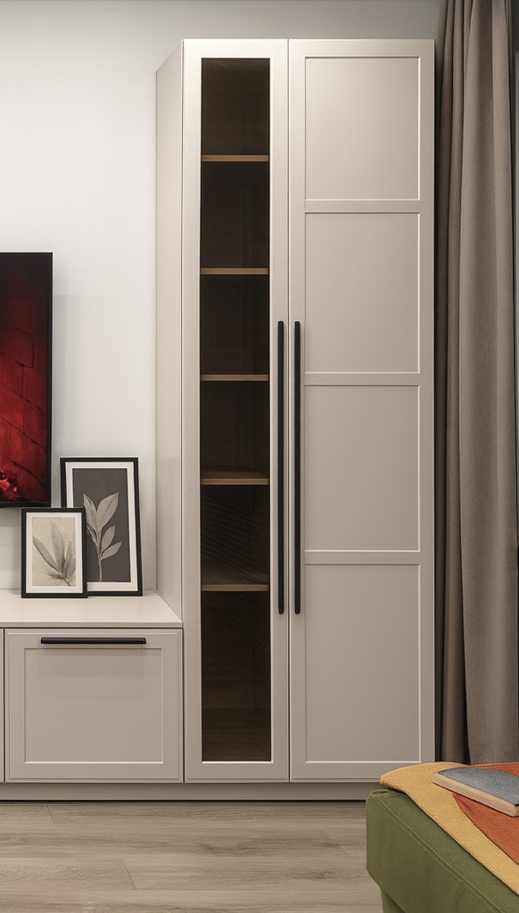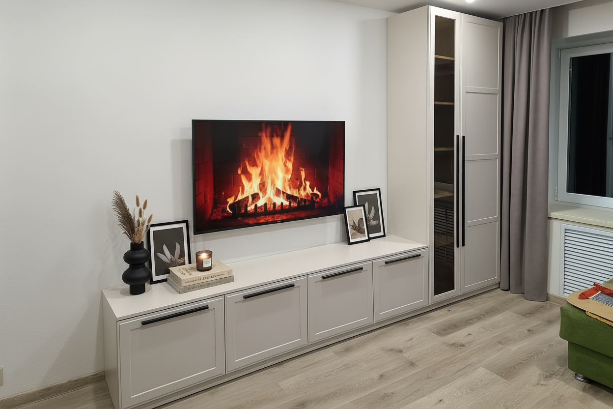 Современная гостиная с лаконичной ТВ-зоной. Низкая тумба и высокий шкаф с витриной создают удобное пространство для хранения, а светлые фасады с контрастной фурнитурой подчеркивают стиль и визуальную лёгкость интерьера.