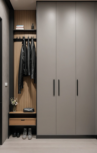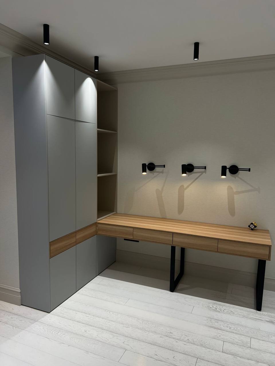 Просторный стол с и выдвижными ящиками создает удобное место для работы. Открытый стеллаж добавляет легкости, высокий шкаф выполняет функцию хранения и зонирования.