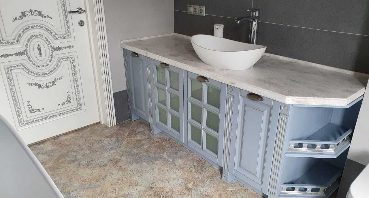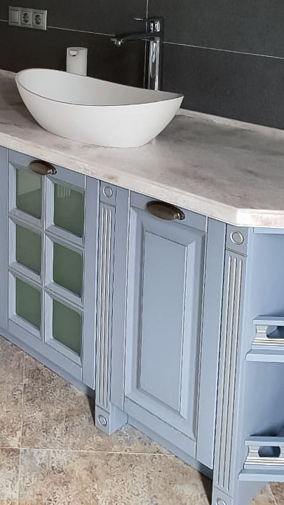 Голубые фасады с патиной и стеклянными вставками придают мебели особый характер, а фигурные пилястры добавляют элегантности. Светлая столешница гармонично дополняет композицию, а накладная раковина подчеркивает современность дизайна. Открытые полки завершают классический образ.