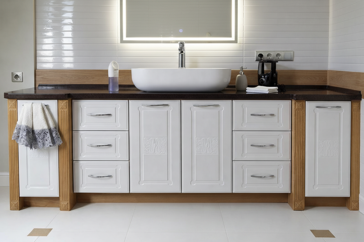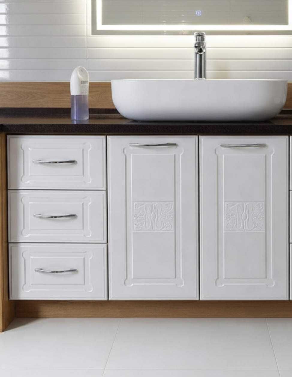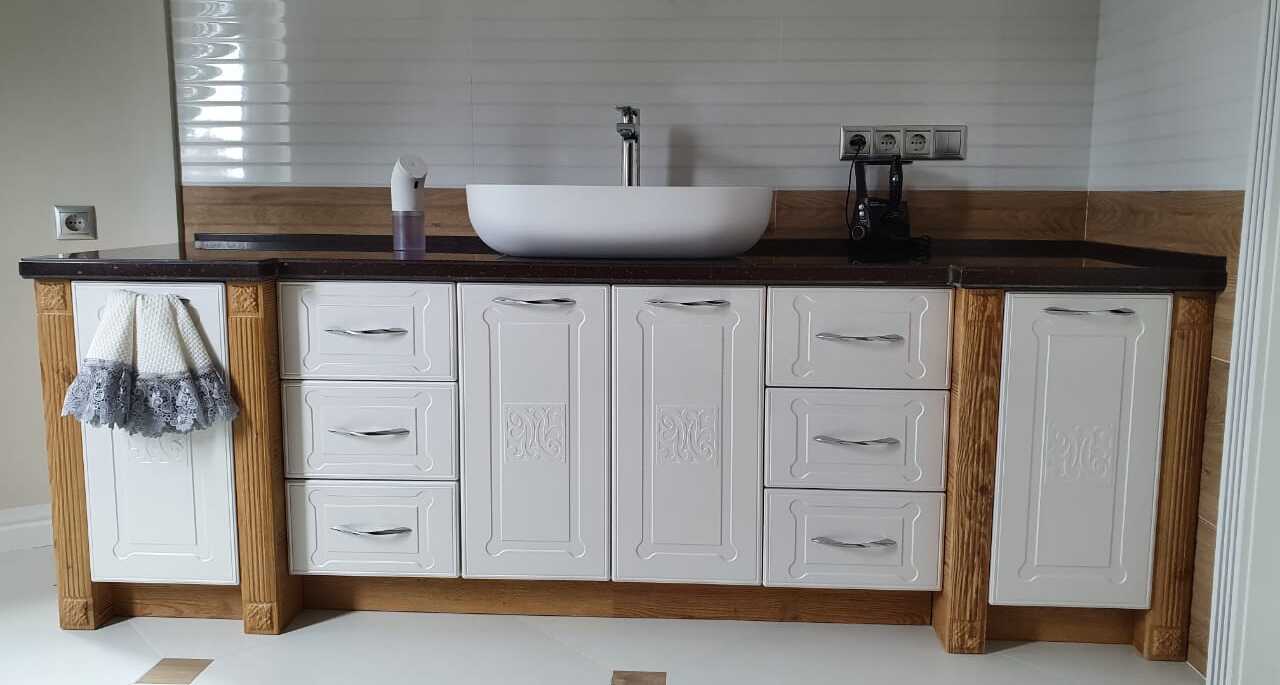 Элегантный классический стиль с нотками уюта и тепла. Белые фасады с изысканной фрезеровкой гармонично сочетаются с натуральным деревом, создавая атмосферу аристократичного уюта. Столешница глубокого оттенка добавляет контраста, а накладная раковина подчеркивает современность дизайна.