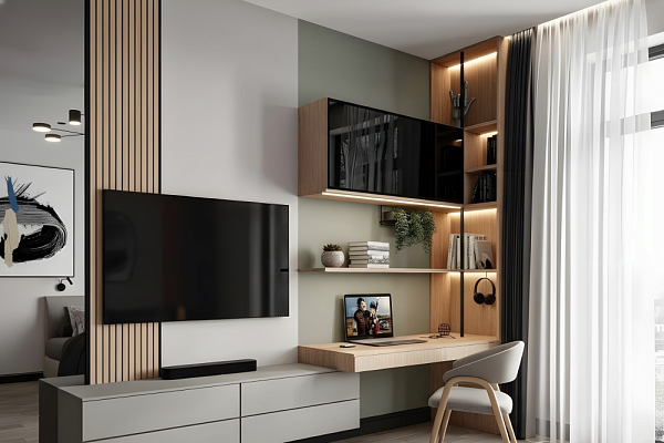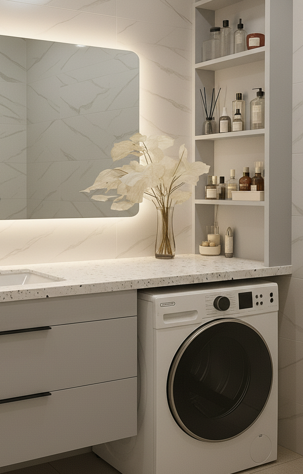 Современная тумба для ванной с интегрированной раковиной и местом под стиральную машину. Лаконичные фасады, вместительные ящики и открытые полки обеспечивают удобное хранение. Светлая палитра и подсветка зеркала создают ощущение чистоты и уюта.